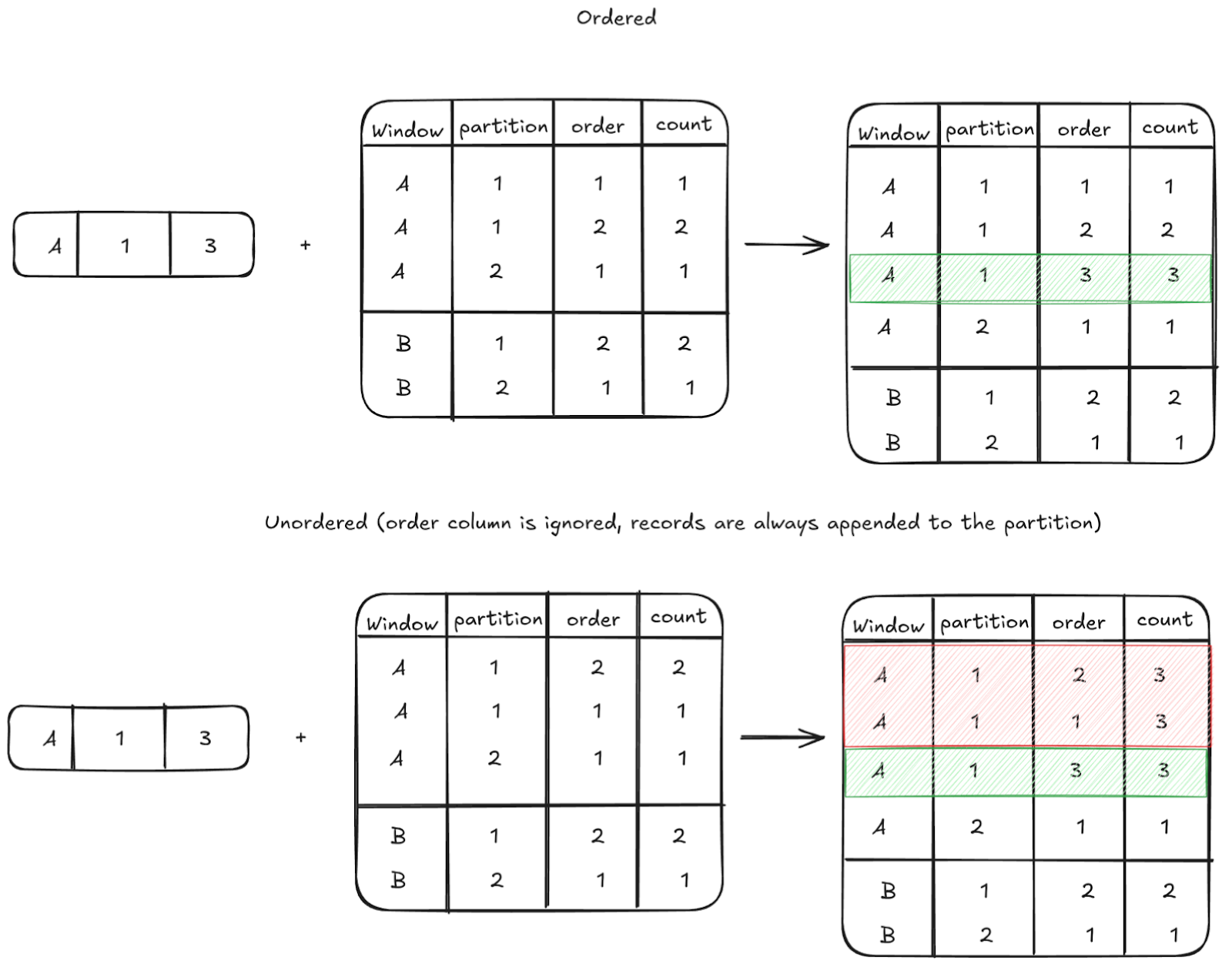 , apply the change, and then re-emit the window? No. We only need to diff that specific partition, since changes to that partition don't affect the rest of the window.